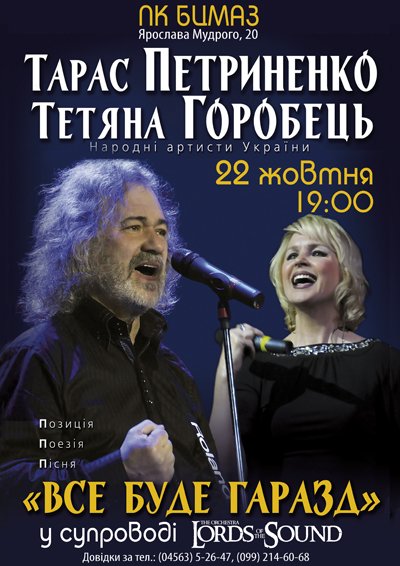 Відомі народні артисти України, Тарас Петриненко та Тетяна Горобець в Білій Церкві. Позиція, поезія, пісня, це гасло їх сумісної роботи «Все Буде Гаразд». На Вас чекає вечір атмосферної, Української музики.
