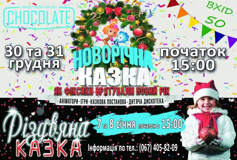 Подаруйте своїм дітям Новорічну Казку. У програмі веселі конкурси, казкова новорічна вистава, дитяча дискотека. Також у програмі аніматори в образах улюблених героїв дитячих мультфільмів та казок.