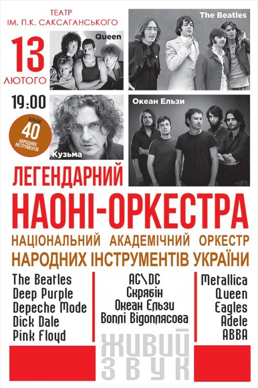 Національний Академічний Оркестр Народних Інструментів України (НАОНІ Оркестра) виступить з унікальною шоу-програмою. Спеціально для вас зі сцени прозвучать світові музичні шедеври, якими захоплюються мільйони. Не пропустіть можливість стати свідком неповторної новаторської гри оркестру Хіти таких світових легенд як The Beatles, Deep Purple, ABBA, Adele, Metallica, Depeche Mode, Pink Floyd і багатьох інших подарують Вам блаженну ностальгію. А саундтреки з улюблених кінофільмів ( «Таксі», «Місія Нездійснена» та інші) занурять в атмосферу екшена.