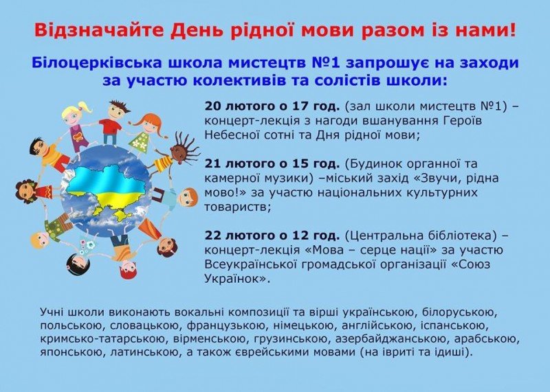Учні школи виконають вокальні композиції та вірша українською, білоруською, польською, словацькою, іспанською, французькою, німецькою, англійською, кримсько-татарською, вірменською, грузинською, арабською, японською , латинською, азербайджанською, а також єврейськими мовами (на івриті та ідиші).