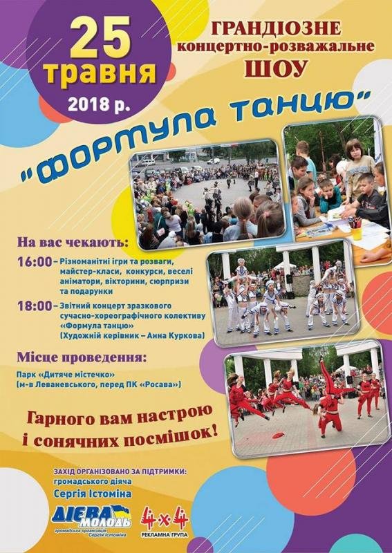 На масиві Леваневського в парку «Дитяче містечко» (перед ПК «Росава») відбудеться один з наймасовіших соціальних заходів «Формула танцю», який молодіжна громадська організація «Дієва молодь» проводить вже третій рік поспіль.
