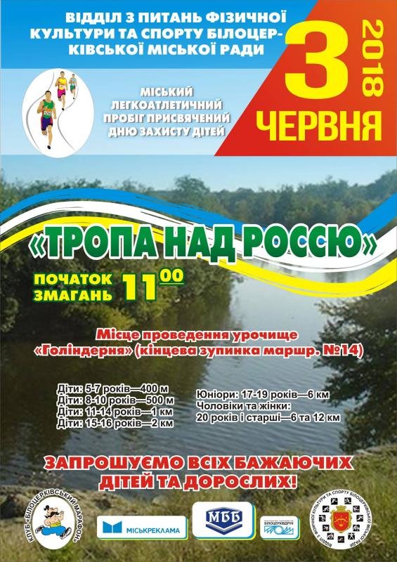 ХХХII Пробіг-пікнік "Тропа над Россю" в урочищі "Голендерня" (кінцева зупинка маршрутки №14) це можливість активно провести вихідний . Пробігти дистанції від 400 метрів для дітей і до 6км та 12км для дорослих в тіні дерев понад річкою - справжнє задоволення. Юшка та чай із димком для всіх його учасників - атрибути цього пробігу.