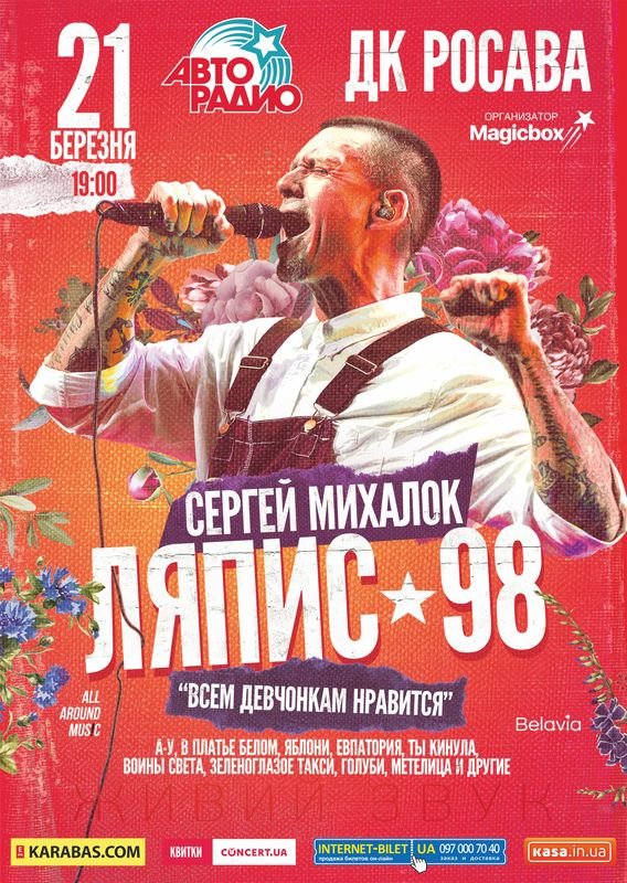 21 березня в Білій Церкві оркестр «ЛЯПІС 98» та його беззмінний лідер Сергій Міхалок представлять ексклюзивне та безкомпромісне за своїми масштабами шоу «Всім дівчатам подобається», присвячене яскравому святу весни та складатиметься тільки з золотих хітів та всенародно улюблених пісень, які співають всі ось уже кілька поколінь!