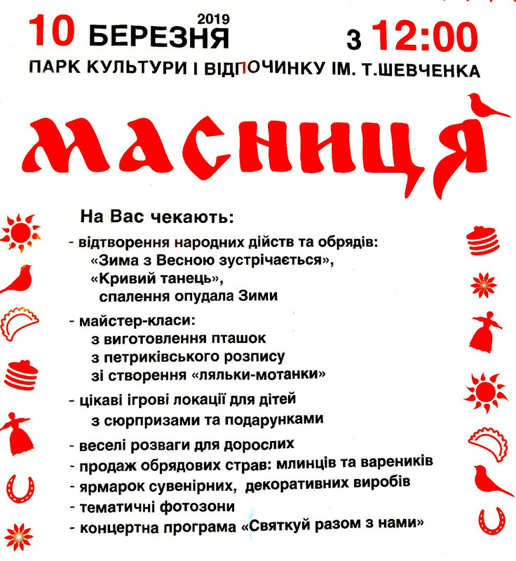 Запрошуємо на чудове весняне свято «Масниця». Сімейна програма заходу урізноманітнить ваші вихідні дні та дасть можливість чудово відпочити.