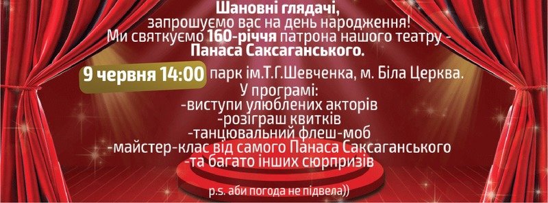 Улюблені наші шанувальники. Запрошуємо вас на святкування 160 річниці патрона нашого театру — Панаса Саксаганського. У програмі заходу на вас чекатимуть: конкурси, виступи акторів театру та багато приємних сюрпризів.