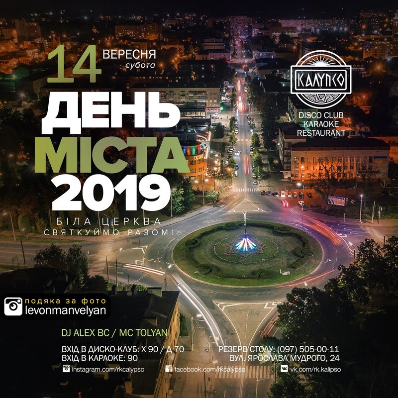 Святкуємо день народження улюбленого міста. Отримайте гарний та позитивний настрій. На сто п'ятдесят відсотків для вас цього вечора працюють - DJ Alex BC та кльовий MC TOLYAN. Гарного відпочинку вам друзі та з дем народження тебе Біла Церкво.