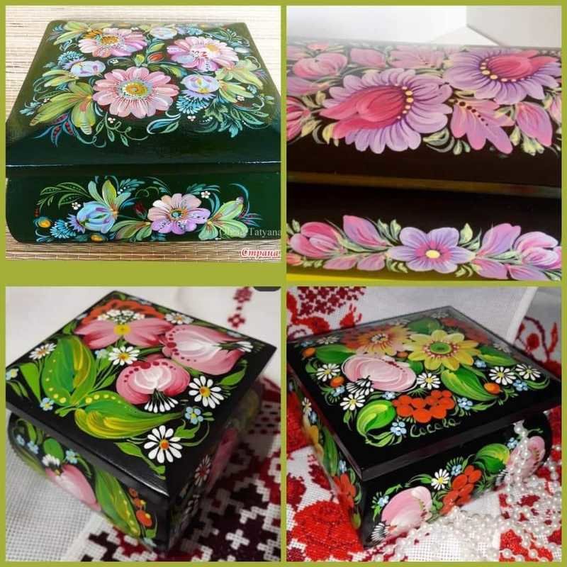 Народні етнічні мотиви все більше набирають популярності. Речі, виконані в техніці петриківського розпису - вважаються модними і стильними. Творча студія дбає про ваш стиль і тому пропонує зробити чергові корисні і красиві речі - шкатулку для ваших прикрас(розмір 11*11см) та кухонну дощечку на чорному тлі.