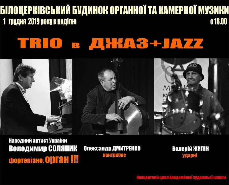 Унікальний концерт: народний артист України Володимир Соляник (м. Київ) на органі та на фортепіано у складі тріо!!! Валерій Жилін (ударні, м. Дніпро), Олександр Дмитренко (контрабас, м.Біла Церква). Запрошуємо відвідати останній джазовий концерт в Білоцерківському будинку органної та камерної музики у 2019 році!