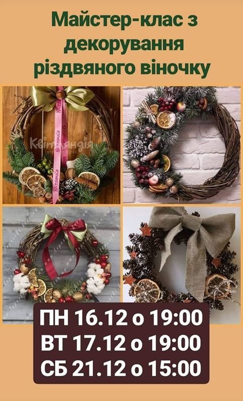 Творча студія "Колібрі" запрошує дорослих та дітей на майстер-клас з виготовлення різдвяного віночку, який стане ексклюзивною прикрасою та оберегом для Вашого дому!