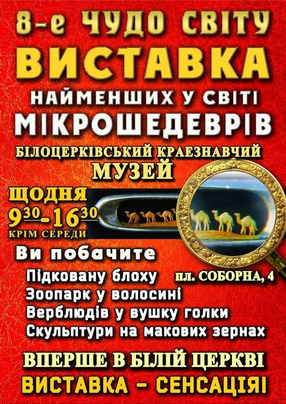 У Білоцерківському краєзнавчому музеї відкрито унікальну виставку мікромініатюр всесвітньо відомого майстра Володимира Казаряна "Восьме чудо світу".