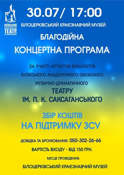 Шановні друзі! Колектив Київського академічного обласного музично-драматичного театру ім. П. К. Саксаганського запрошує на благодійний концертн. Весь прибуток буде спрямовано на підтримку ЗСУ.