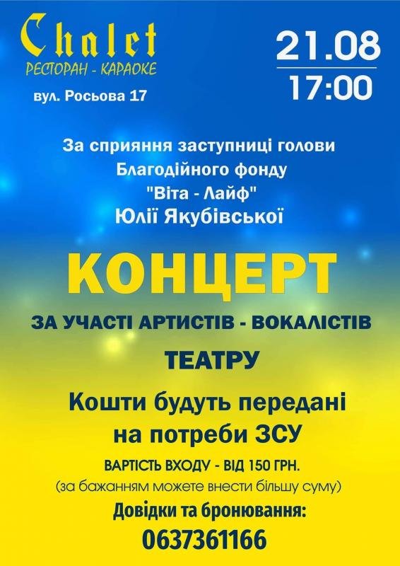 Шановні жителі Білоцерківської громади! Ресторан - караоке Shale't запрошує вас відвідати Благодійний Концерт на підтримку Збройних сил України за участі артистів та вокалістів театру ім. П. К. Саксаганського.