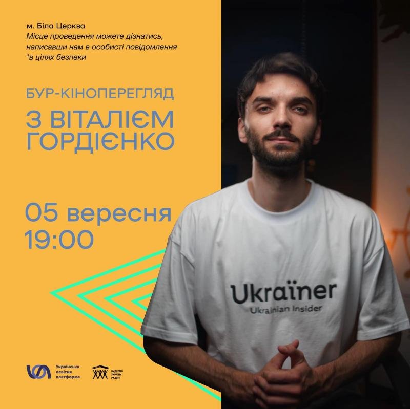 5 вересня о 19:00 від Молодіжного центру буде проводитись БУР-кіноперегляд. Ведучий — Віталій Гордієнко.