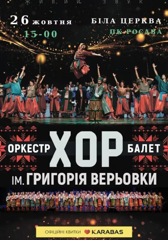 26 жовтня на вас чекає неймовірна програма, до якої увійдуть нові та улюблені, добре відомі народні пісні, танці, оркестрові твори та вокально-хореографічні композиції: «Несе Галя воду», «Туман яром», «Ой, хмелю», «Козачок з бубнами», «Святковий гопак», «Запорожці», «Аркан» та інші.