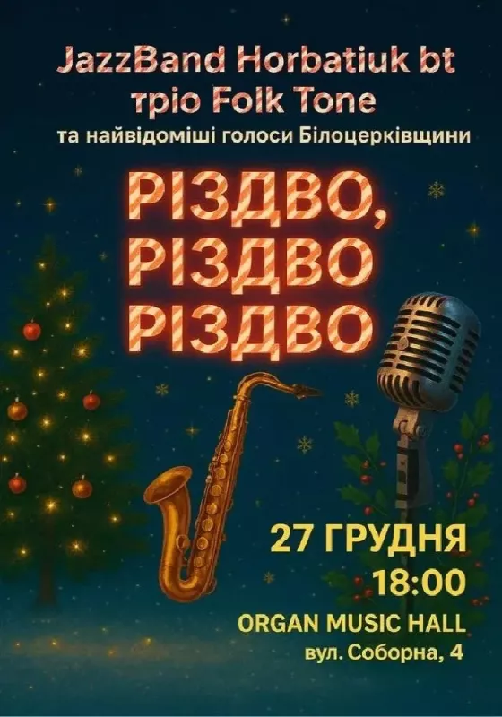Свято, наповнене музикою, теплом і справжнім різдвяним настроєм! На сцені — JazzBand Horbatiuk bt, тріо Folk Tone та найвідоміші голоси Білоцерківщини.