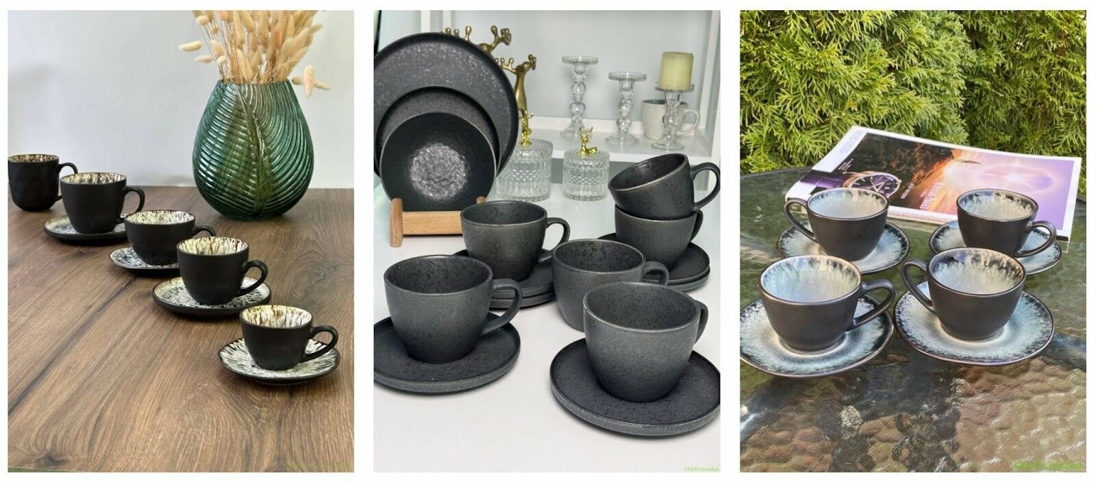 - Кераміка: Міцніша за порцеляну, товстіші стінки, краще зберігає тепло. Чудовий вибір для кавового набору чашок та щоденного використання.