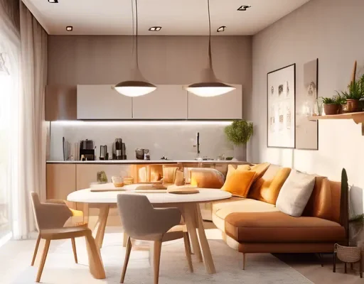 Поєднання загального, робочого та акцентного освітлення допомагає виділити різні зони кімнати та покращує її атмосферу. М'яке, тепле освітлення може створити затишну атмосферу, тоді як правильно розміщені лампи або світильники підкреслюють ключові елементи дизайну, такі як твори мистецтва або архітектурні особливості.