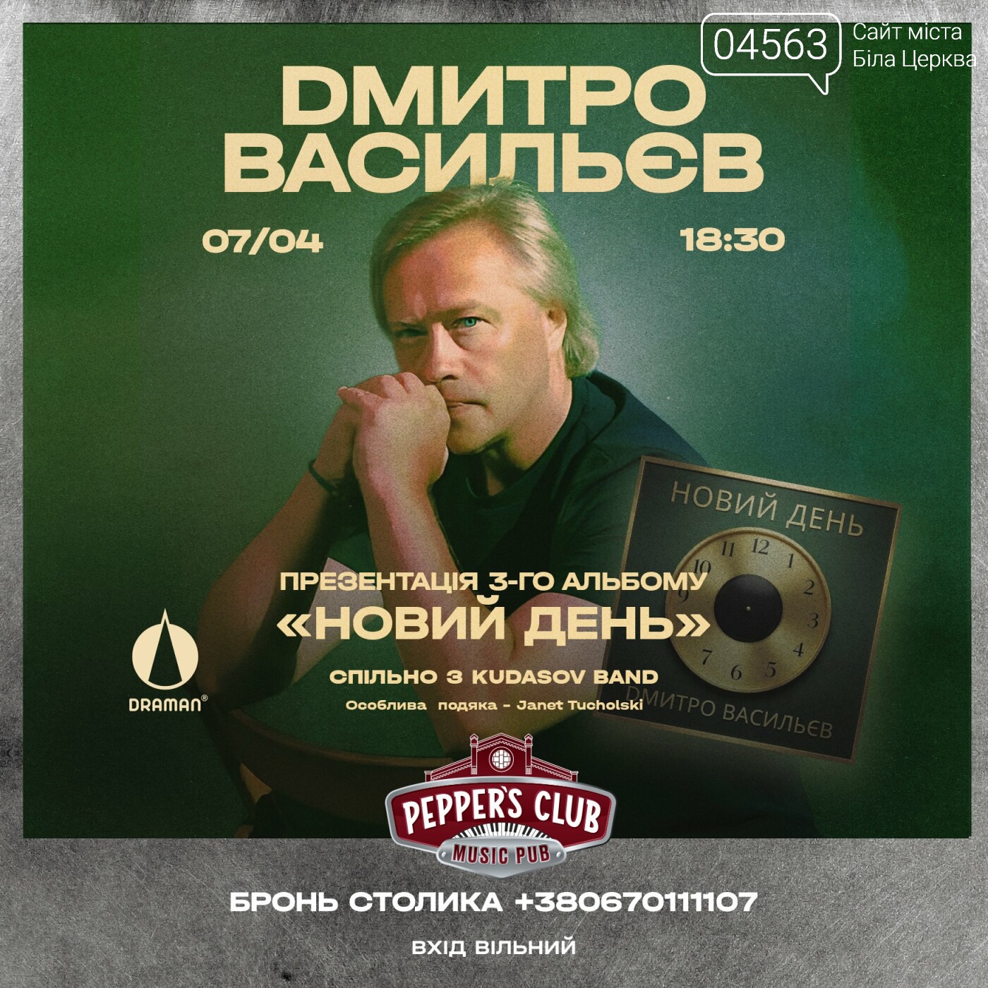 Цього вечора нову концертну програму представить Dмитро Васильєв — політолог, який паралельно ще й займається музикою. У Pepper’s він презентує третій альбом «Новий День» у супроводі Kudasov Band.