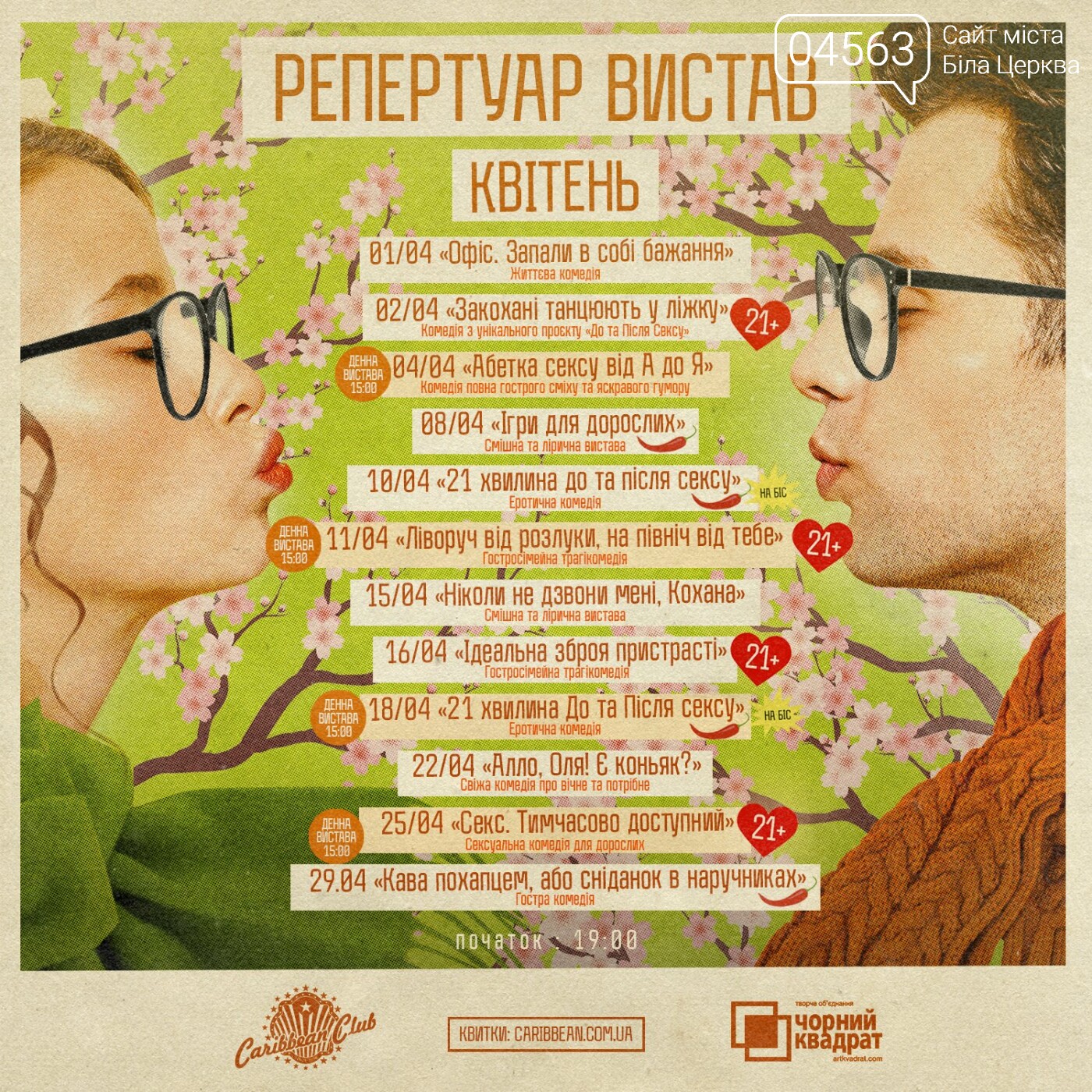 У квітні на сцені — постановки театру «Чорний Квадрат», який працює із жанром сучасної комедії про стосунки та повсякденні ситуації.